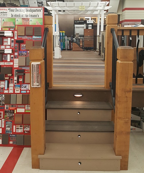 What do we have in store for you? Over 400 linear feet of full-size, installed railing. More than 2,300 square feet with over 60 colors of full-size, installed deck boards. And deck lighting? You won't believe your eyes. You'll see riser lights, post cap lights, recessed surface lights, and more! It's definitely worth the trip to Hackmann to check out your options for the deck of your dreams!